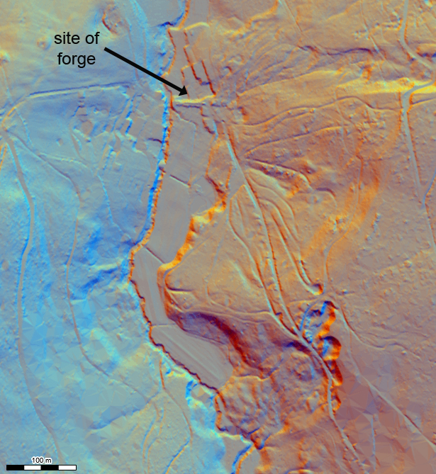 Working area: Lawn between probably ironmaster's house and stream made up to some depth with forge cinder. Many forge bottoms in stream, also glassy furnace slag supporting Straker's belief in a furnace here also. Part-mould for 14cm (24lb) cannon balls, probably intended for remelting, preserved at Glaziers Farm.